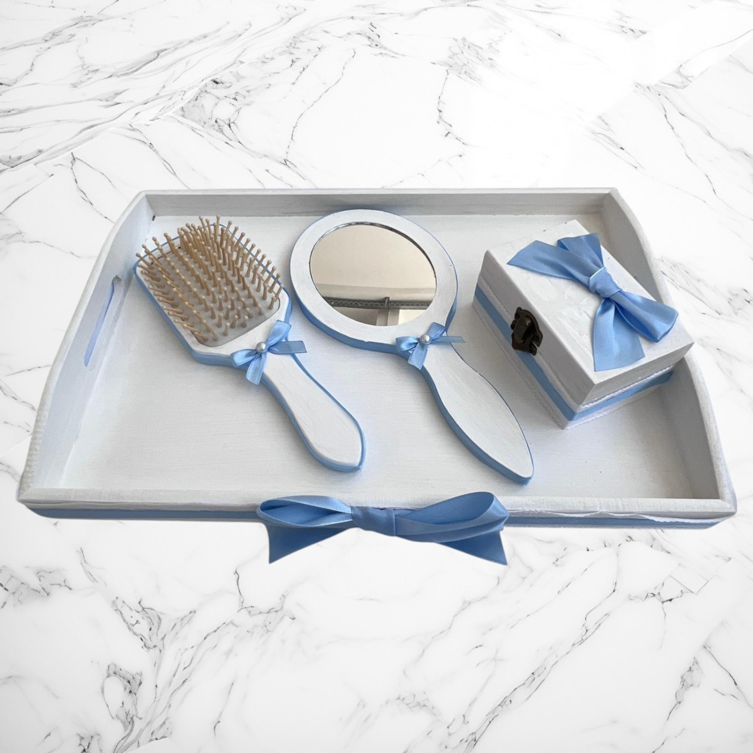 Tavă decorativă din lemn, vopsită manual în alb cu margini bleu, accesorizată cu fundă satinată bleu și perlă decorativă, perfectă pentru prezentare și organizare.