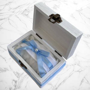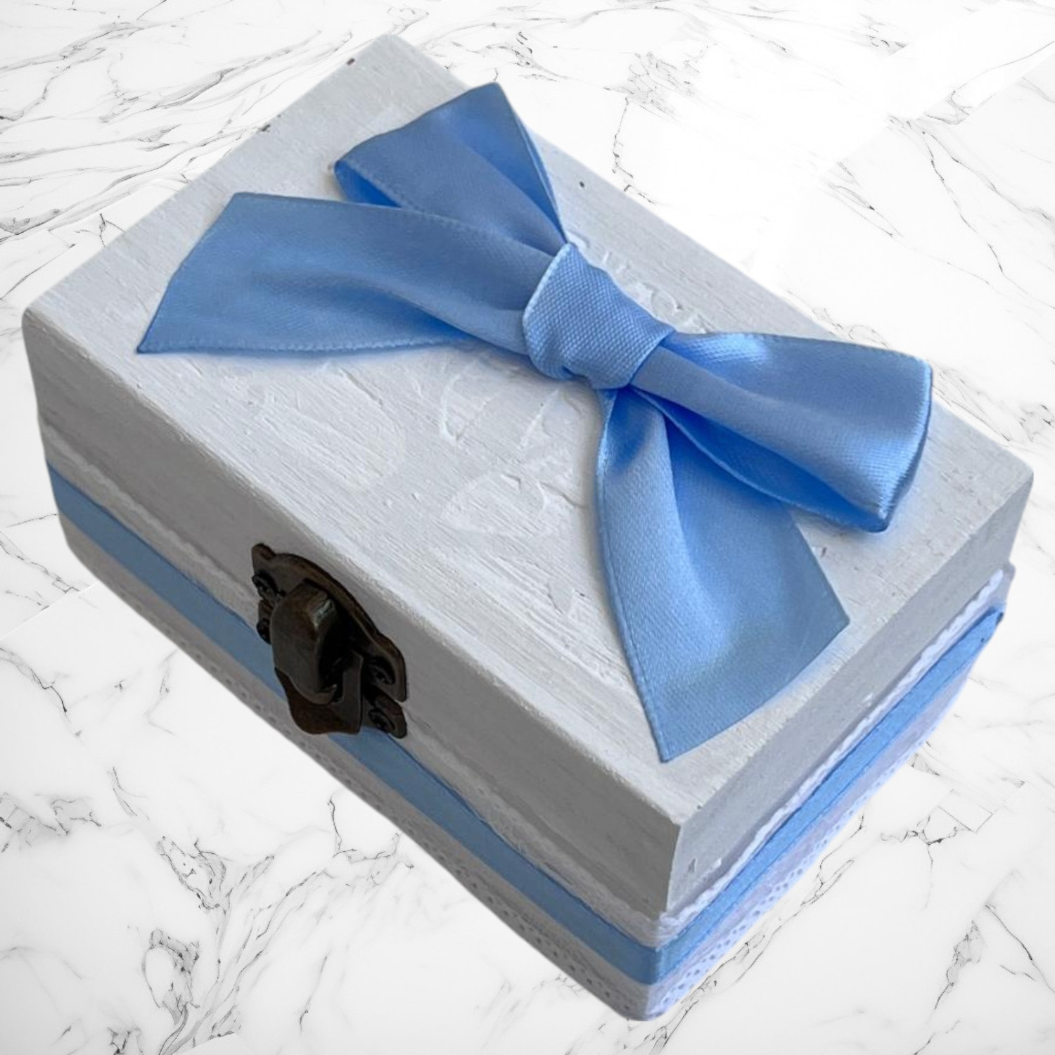 Cutiță pentru bijuterii sau obiecte simbolice, accesorizată cu fundă satinată și închidere metalică, un detaliu chic pentru păstrarea accesoriilor importante.