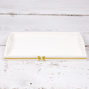Setul este format din tava, cutie pentru verighete si doua obiecte de ingrijire: oglinda, respectiv perie de par. Toate acestea sunt vopsite in alb si decorate cu banda aurie si fundite cu jumatati de perla in mijloc.