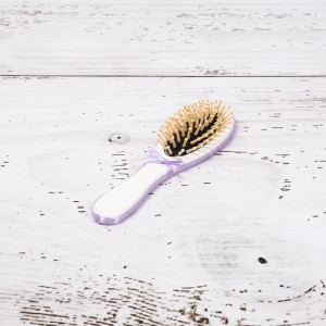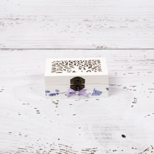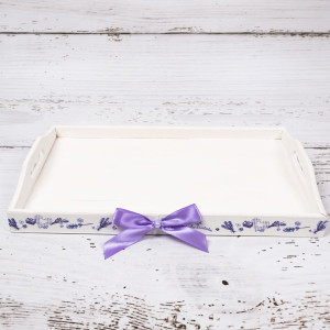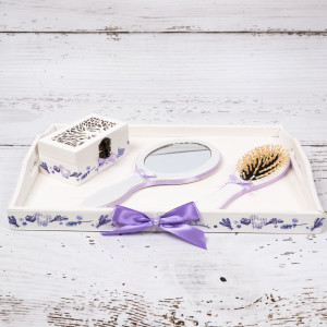 Pentru o nunta de primavara cu tema Lavanda, o mireasa delicata poate folosi un set gatitul miresei cu model lavanda si fundite lila, pentru traditia numita Gatitul miresei. Setul este format dintr-o tavita de sustinere, oglinda mireasa, perie de par si cutie pentru verighete, fabricate din lemn.