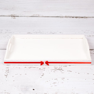 In timp ce tavita si cutia pentru verighete au o banda din dantela, peria de par si oglinda sunt decorate cu o banda rosie satinata. In plus, toate articolele din set au fundita rosie cu perluta alba in mijloc.
