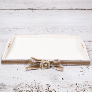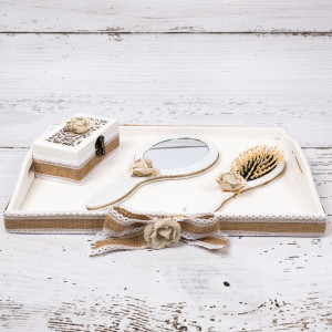 Cele patru accesorii care alcatuiesc acest set sunt vopsite in alb cu vopsea non-toxica. Tavita este decorata cu o banda din iuta si cu o fundita din acelasi material cu o floare textila in mijloc.