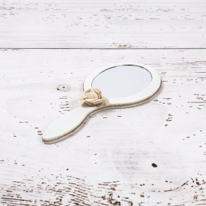 Oglinda si peria de par au un snur din sfoara si o floare, in timp ce cutiuta de verighete este decorata cu o banda de iuta si floare. Acest set pentru gatitul miresei este ideal pentru nuntile in stil rustic.