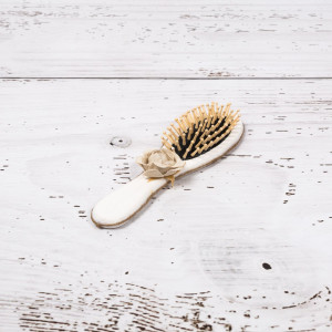 Acest set pentru gatitul miresei cu decor rustic este format din tava, perie, cutie de verighete si oglinda, confectionate din lemn si decorate manual in atelierul SelfEvents.ro.