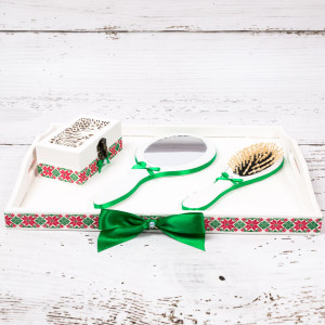 Pentru o nunta in stil traditional la care predomina culoarea verde, setul gatitul miresei cu decor traditional si fundite verzi este ideal pentru obiceiul de infrumusetare al miresei numit gatitul miresei.