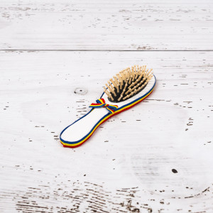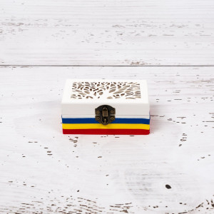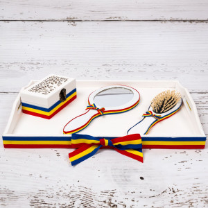 Un set complet pentru gatitul miresei este format din: tavita de sustinere, cutie pentru verighete, oglinda si perie de par. Produsele sunt fabricate din lemn, decorate manual cu grund non-toxic si model tricolor.
