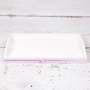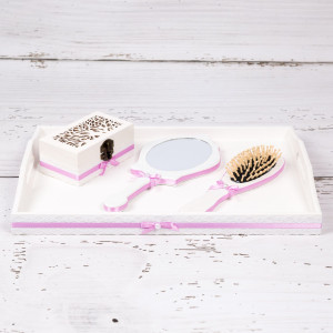 Cele patru articole care alcatuiesc acest set sunt realizate din lemn, vopsite in alb si decorate manual cu banda lila, dantela si fundite asortate cu perlute in mijloc.