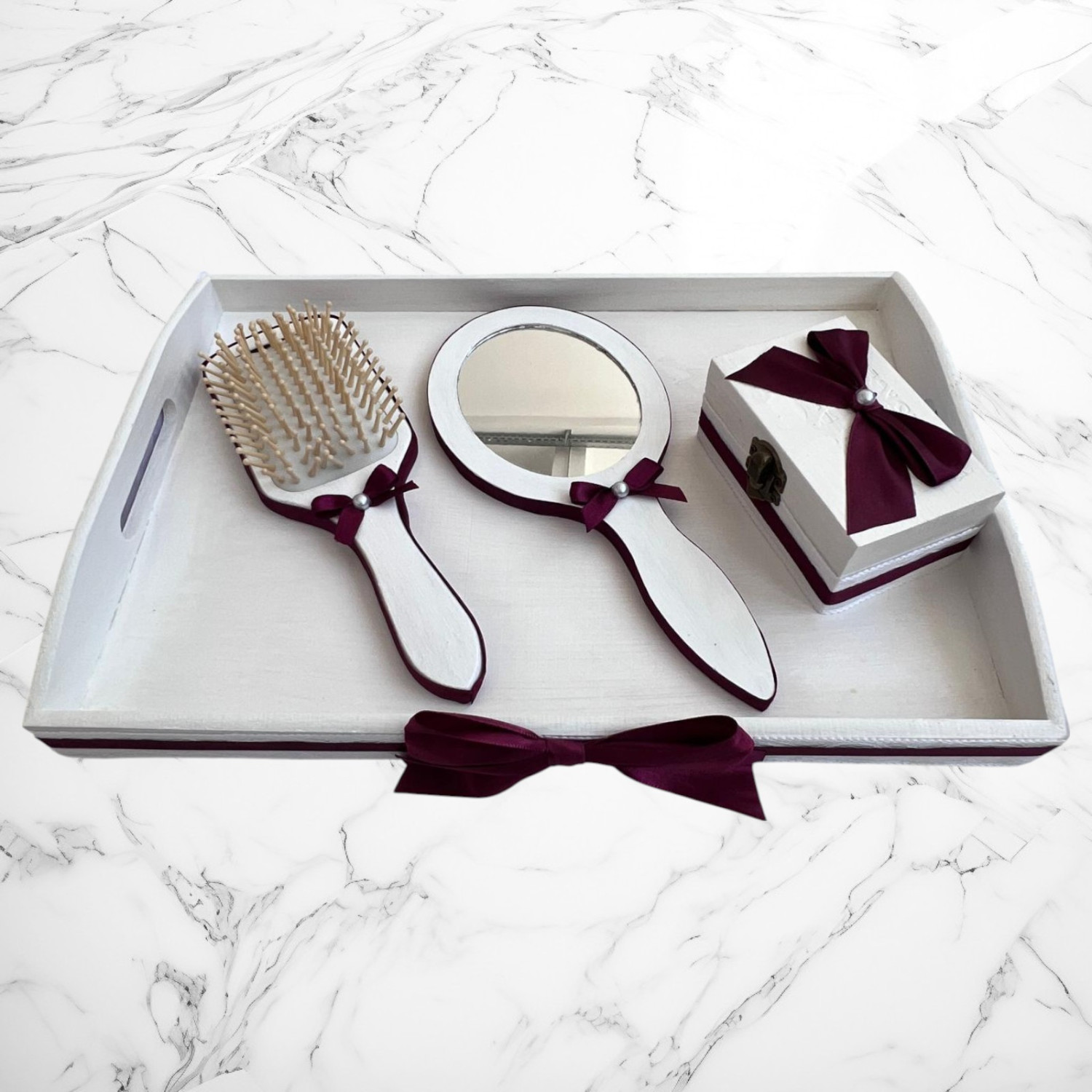 Tavă decorativă din lemn, albă, pictată manual, cu margini și fundă satinată grena– ideală pentru prezentare și organizare.