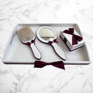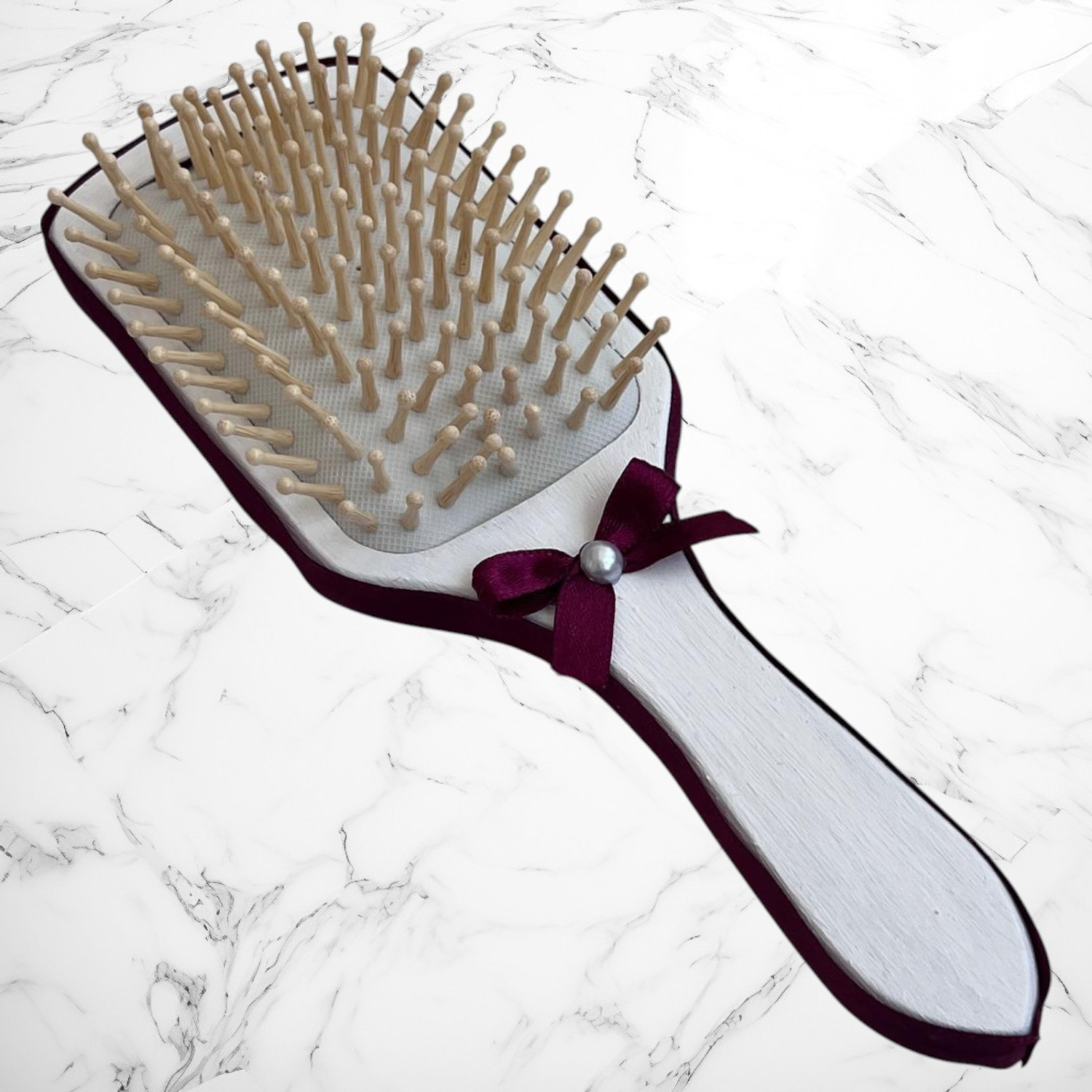 Perie de păr cu mâner din lemn, finisaj alb cu accente grena și fundiță decorativă – un accesoriu simbolic și practic.