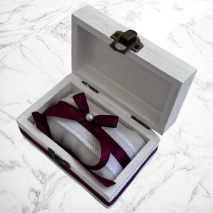 Adaugă eleganță și rafinament momentului tradițional al gătitului miresei cu acest set realizat manual, decorat cu funde satin grena și perle delicate. Designul alb imaculat, completat de detalii grena, oferă un contrast deosebit și un aer regal.