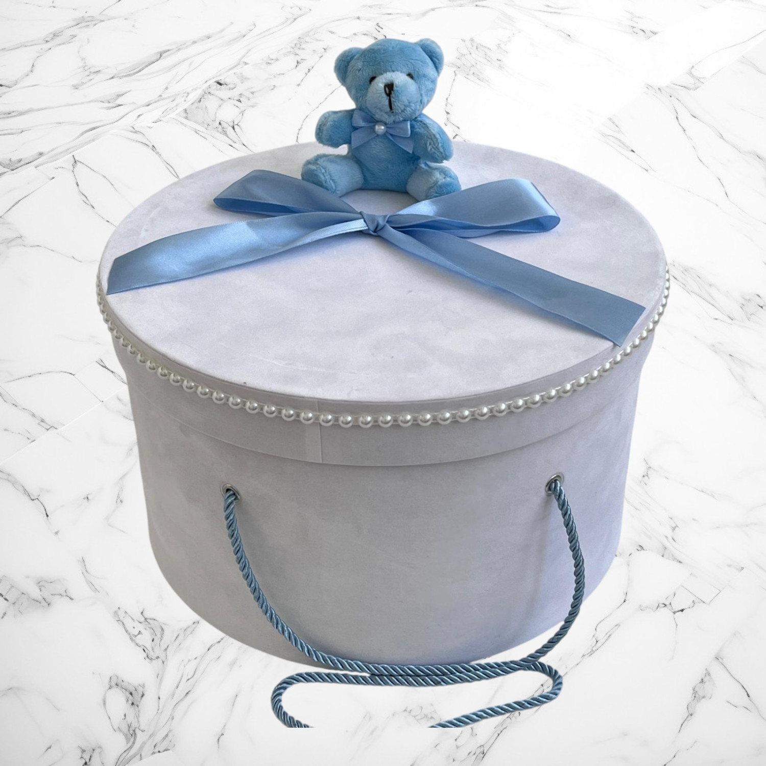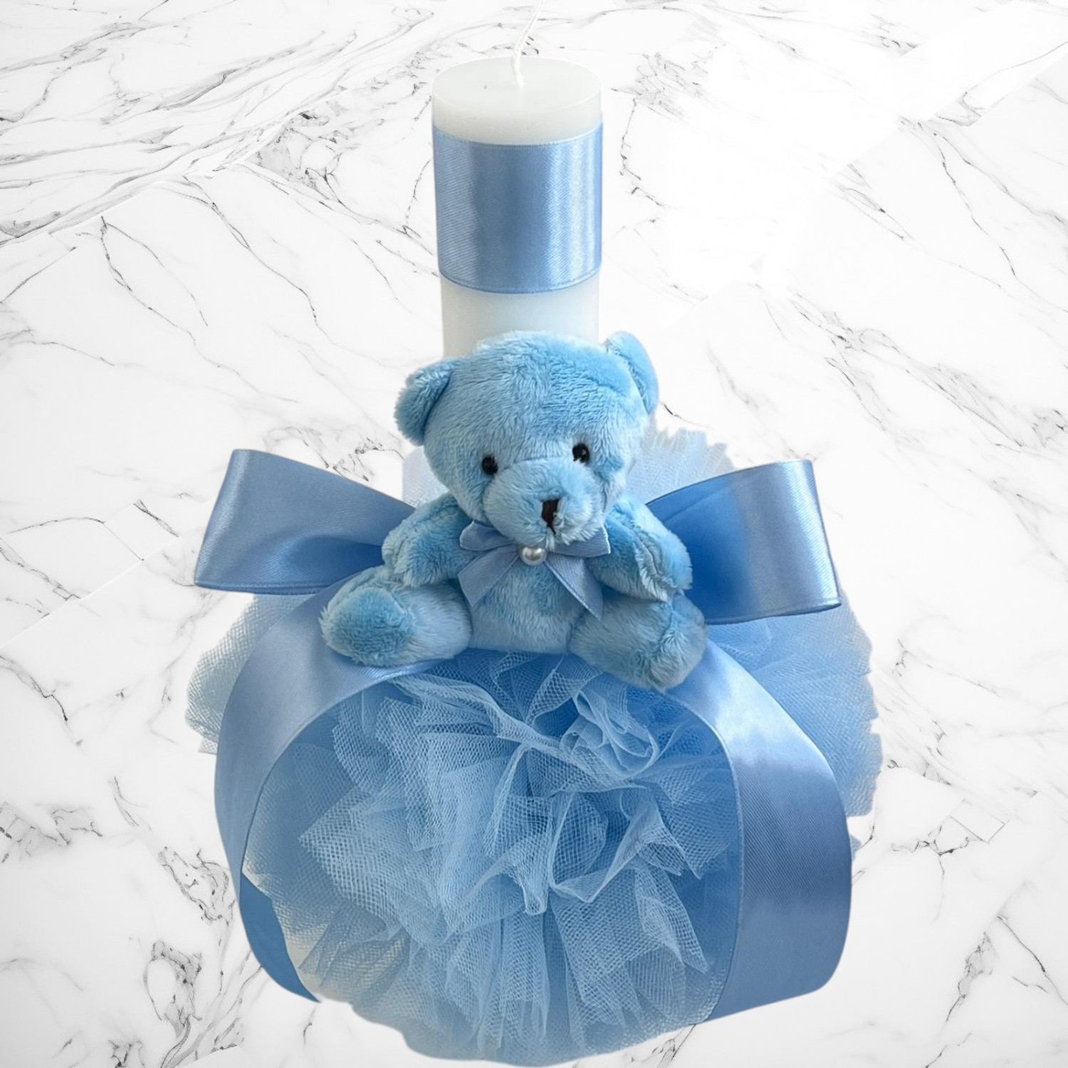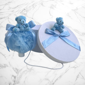 Comanda acum produsul "Set botez bleu cu ursuleț – Cutie pentru hăinuțe și lumânare".