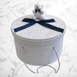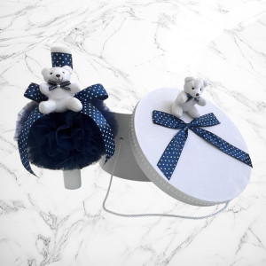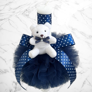 Comanda acum produsul "Set botez bleumarin cu buline cu ursuleț – Cutie pentru hăinuțe și lumânare".