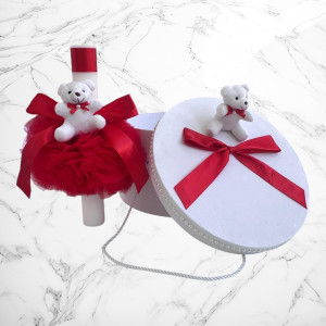 Comanda acum produsul "Set botez rosu cu ursuleț – Cutie pentru hăinuțe și lumânare".