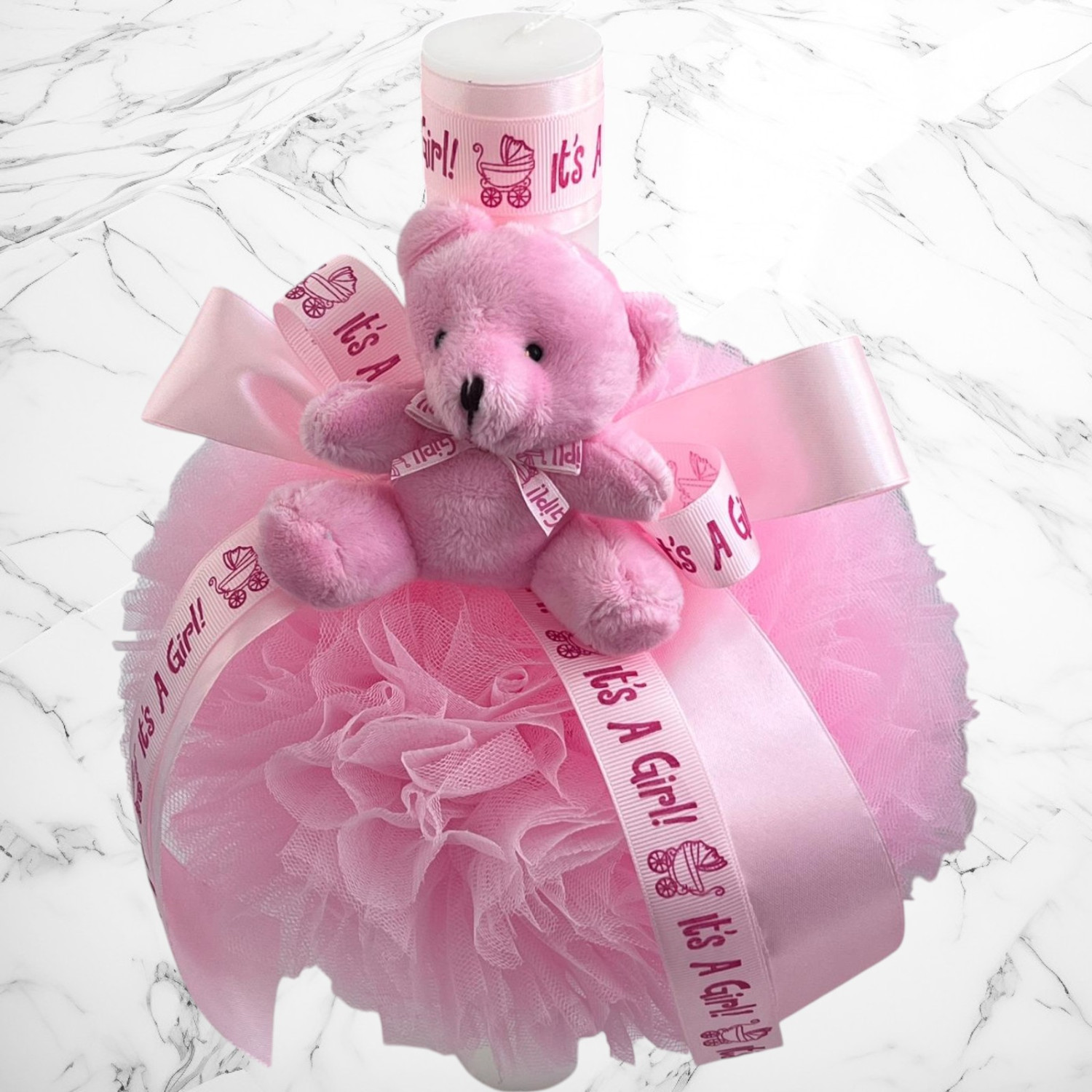 🕯️ Lumânare botez – cu o înălțime de 35 cm și un diametru de 4.5 cm, împodobită manual cu dantelă, fundițe și un ursuleț adorabil, oferind un plus de farmec ceremoniei.