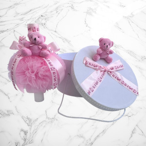✨ Cutie trusou – rotundă, de culoare albă, cu un diametru de 33 cm și o înălțime de 20 cm, decorată cu detalii rafinate și un ursuleț drăgălaș, ideală pentru păstrarea amintirilor prețioase.
