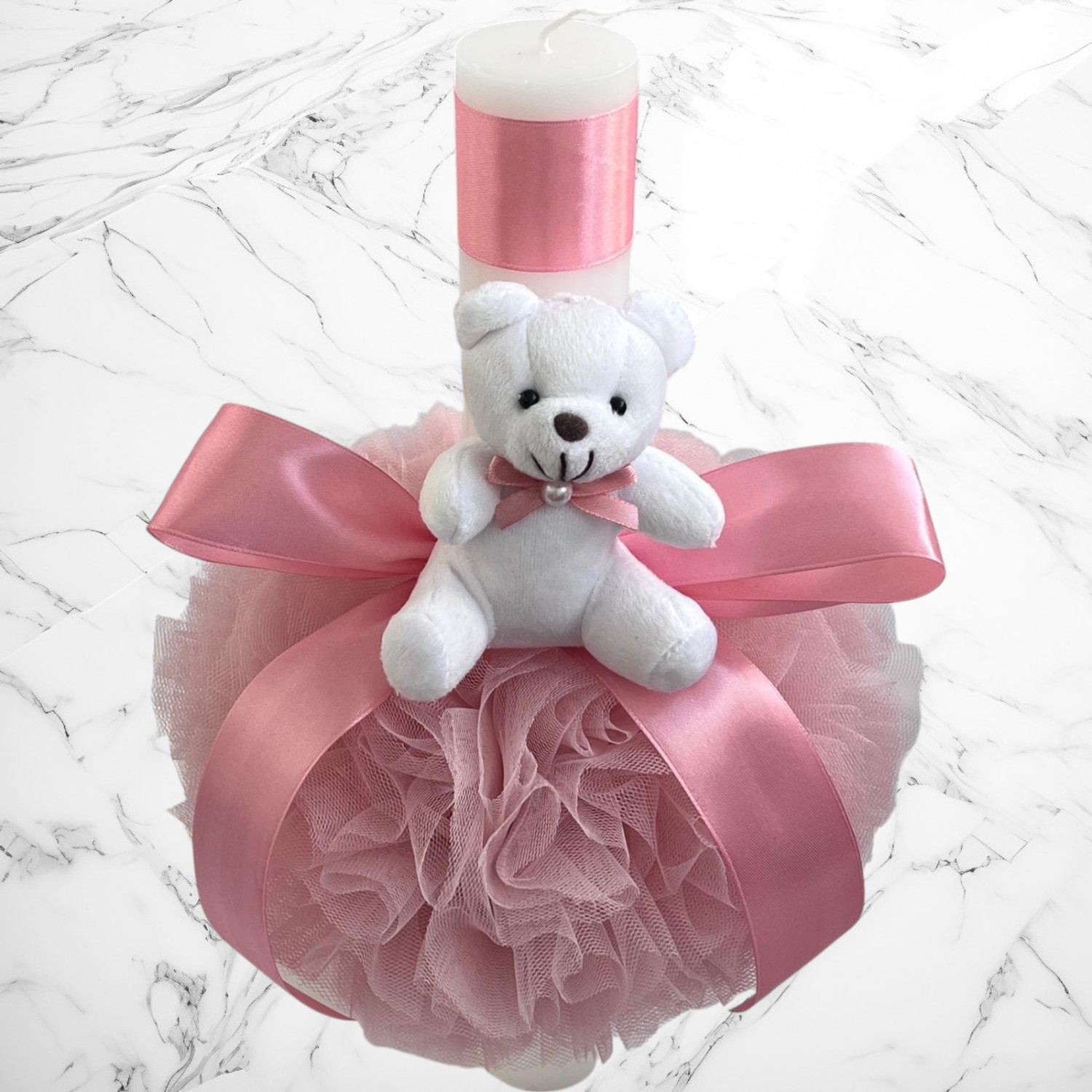 Set botez roz pudra cu ursuleț – Cutie pentru hăinuțe și lumânare