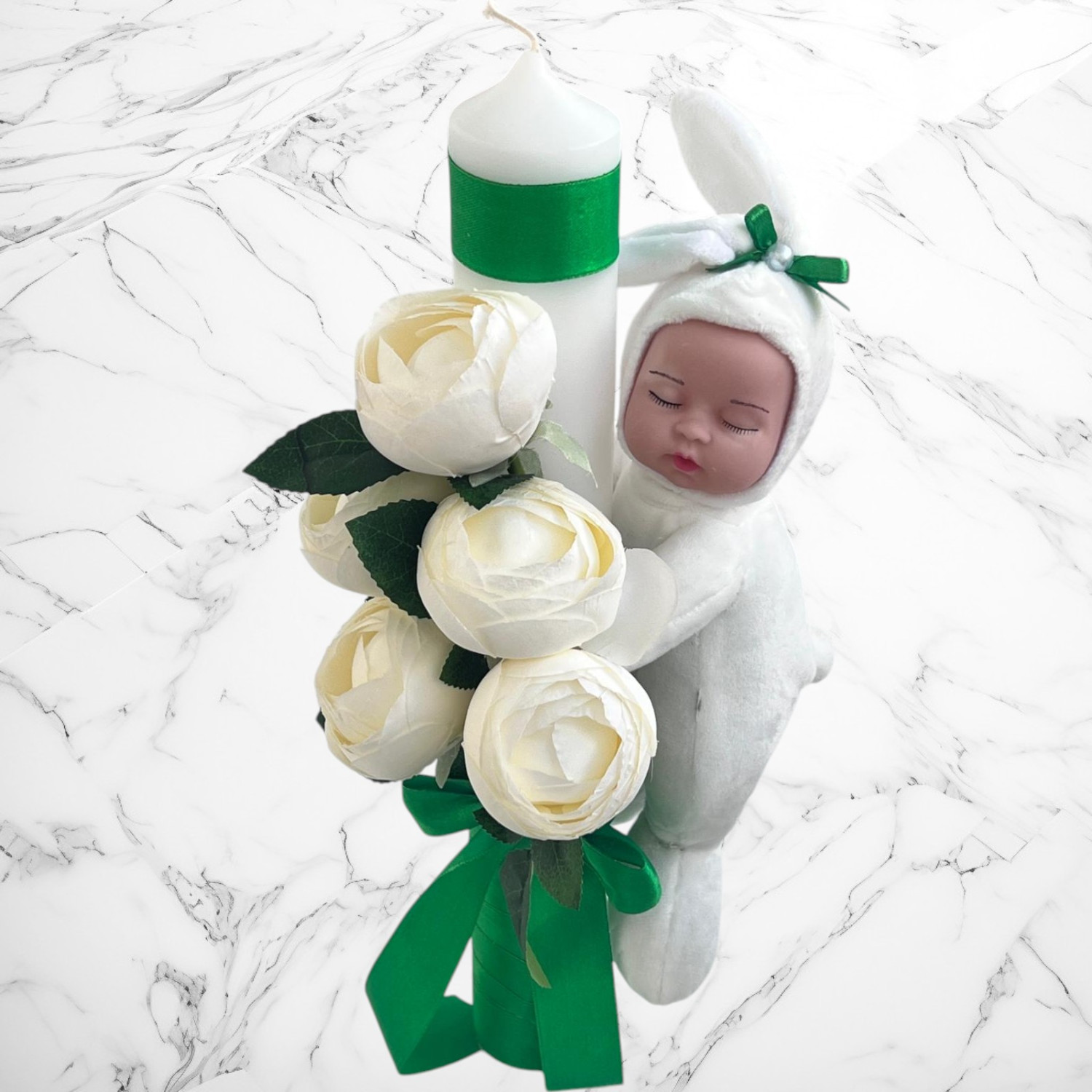 Comanda acum produsul "Set botez verde cu bujori – Cutie pentru hăinuțe și lumânare".