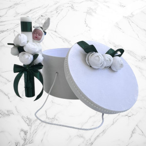 Acest set elegant pentru botez aduce un plus de rafinament și delicatețe ceremoniei, fiind decorat cu un superb buchet de bujori artificiali. Setul conține o cutie specială pentru hăinuțe și o lumânare de botez, ambele accesorizate cu flori realizate cu atenție la detalii, pentru un aspect deosebit.
