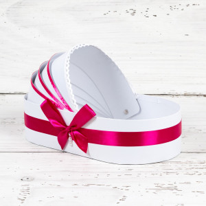 - cutiuta in forma de cufar pentru prima suvita. Micul cufar din lemn este decorat cu vopsea inofensiva pentru sanatate, data cu lac si decorata manual cu fundita si banda roz fucsia. Dimensiuni cutie mot/turta: 9 cm x 5,5 cm x 5 cm (L x l x H).