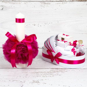 Lumanarea cu tulle roz fucsia are inaltimea de 35 cm si diametrul 5,5 cm. Aceasta este realizata din ceara alba.