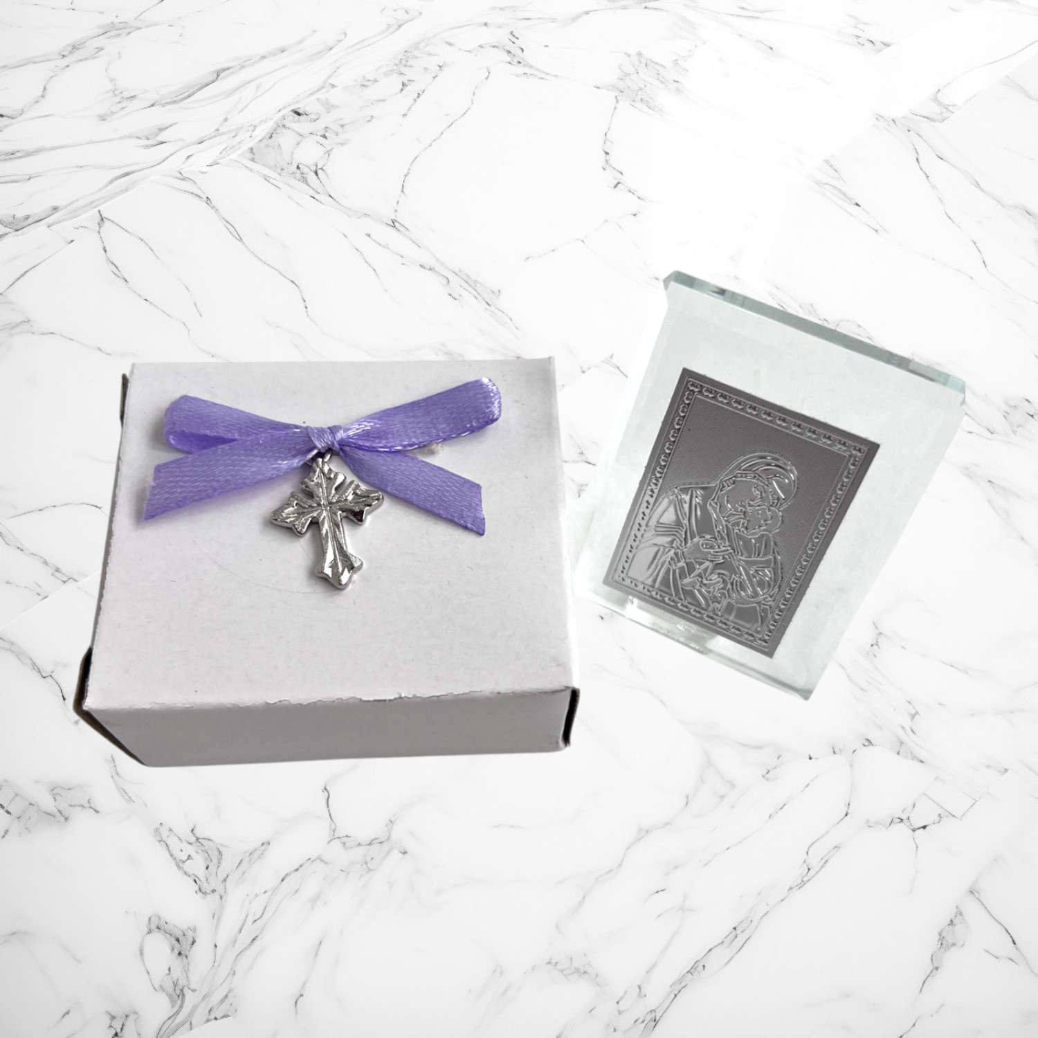 🙏 Mărturie iconiță cu Maica Domnului și pruncul Iisus – realizată din foiță de aluminiu lipită pe sticlă.