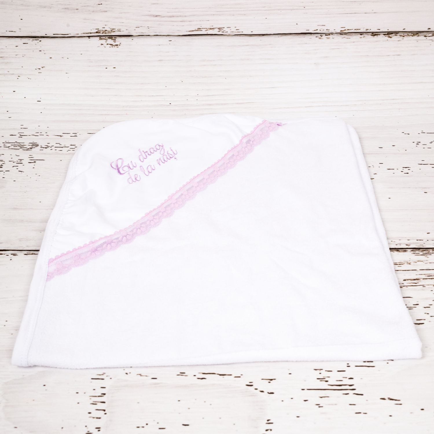 🍼 Prosop cu capișon pentru bebeluș – confecționat din bumbac moale, brodat cu mesajul "Cu drag de la nași";