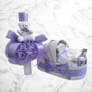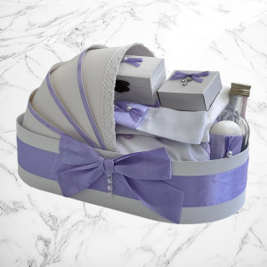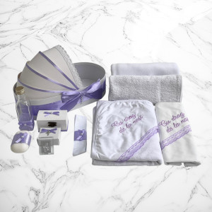 Toate elementele trusoului sunt așezate într-o cutie albă din carton, în formă de landou, decorată cu fundă și perlute