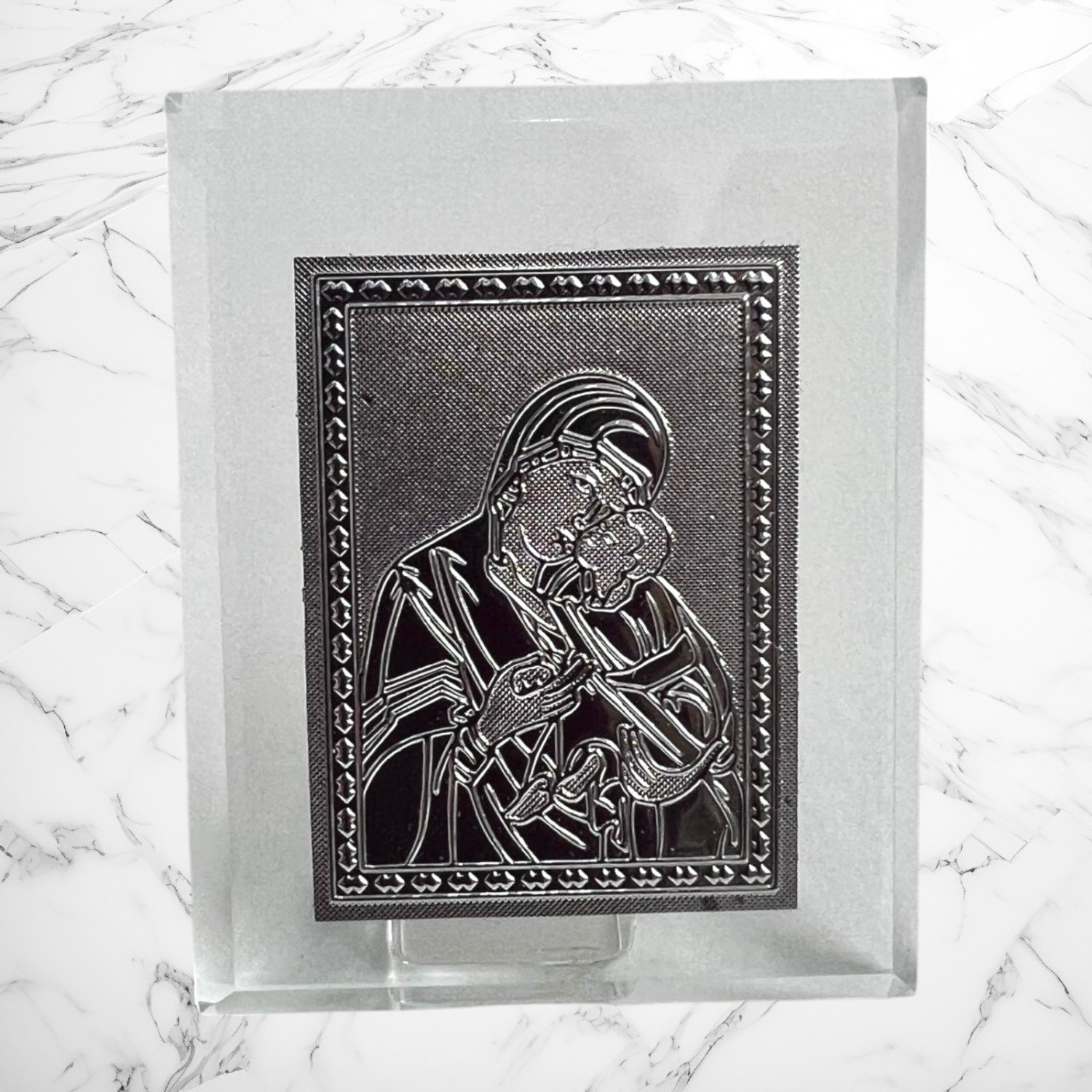 🙏 Mărturie iconiță cu Maica Domnului și pruncul Iisus – realizată din foiță de aluminiu lipită pe sticlă.