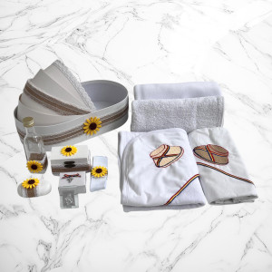 Toate elementele trusoului sunt așezate într-o cutie albă din carton, în formă de landou, decorată cu fundă și perlute