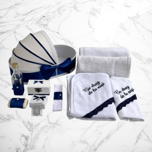 Comanda acum produsul "Set botez lumânare și trusou Cu drag de la nași - bebeluș bleumarin".