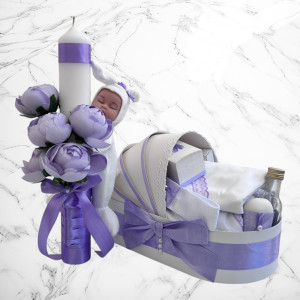 Comanda acum produsul "Set botez lumânare și trusou Cu drag de la nași - bebeluș lila".