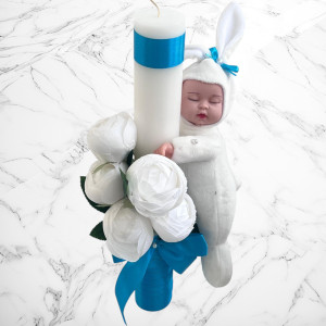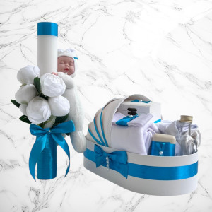 Comanda acum produsul "Set botez lumânare și trusou Cu drag de la nași - bebeluș turcoaz".