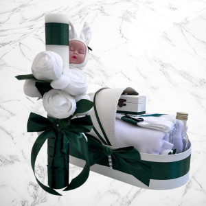 Comanda acum produsul "Set botez lumânare și trusou Cu drag de la nași - bebeluș verde închis".