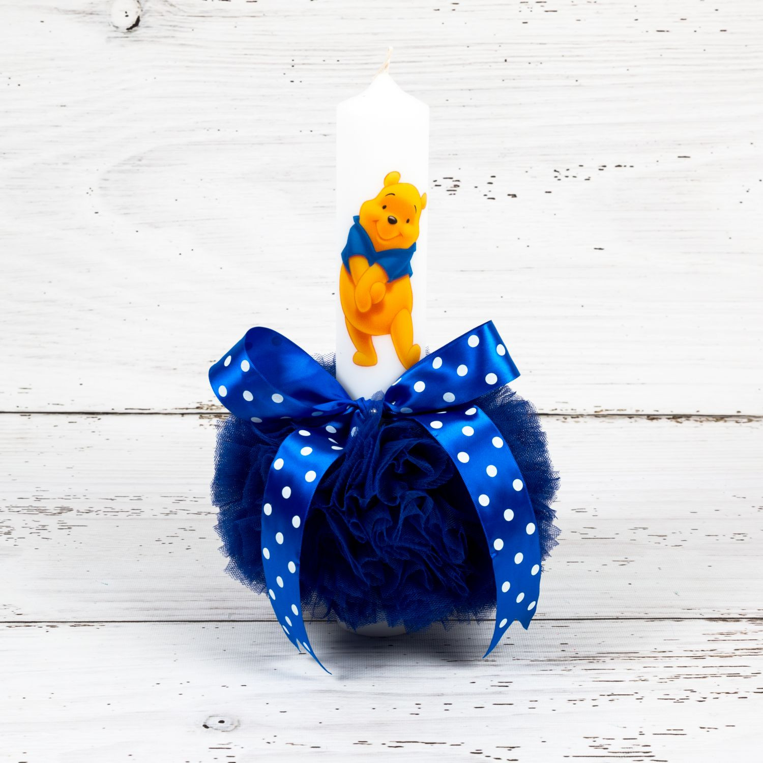 Lumanarea botez cu imaginea pictata a lui Winnie The Pooh si pampon albastru va fi tinuta aprinsa pe durata slujbei, iar dupa eveniment parintii micutului o pot aprinde la nevoie. Inaltime: 35 cm. Diametru: 5,5 cm.
