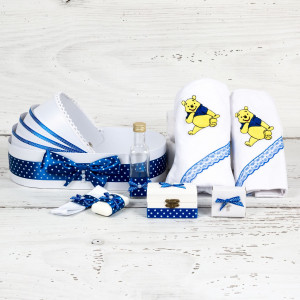 Setul botez compus din lumanare cu tulle albastru, panglica asortata, alaturi de trusoul biserica cu model Winnie The Pooh este o alegere excelenta pentru botezul unui baietel. Dupa stabilirea temei evenimentului, nasii de botez pot cumpara cele necesare pentru biserica, daca vor sa respecte traditiile din tara noastra.