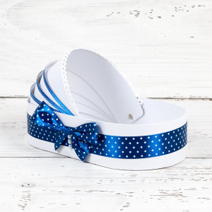 - cutiuta in forma de cufar pentru prima suvita. Micul cufar din lemn este decorat cu vopsea inofensiva pentru sanatate, data cu lac si decorata manual cu fundita si banda bleumarin. Dimensiuni cutie mot/turta: 9 cm x 5,5 cm x 5 cm (L x l x H).