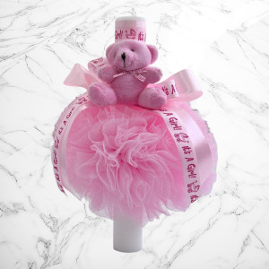 Decor: Manual, cu pampon din tulle, panglică din satin și ursuleț de pluș detașabil