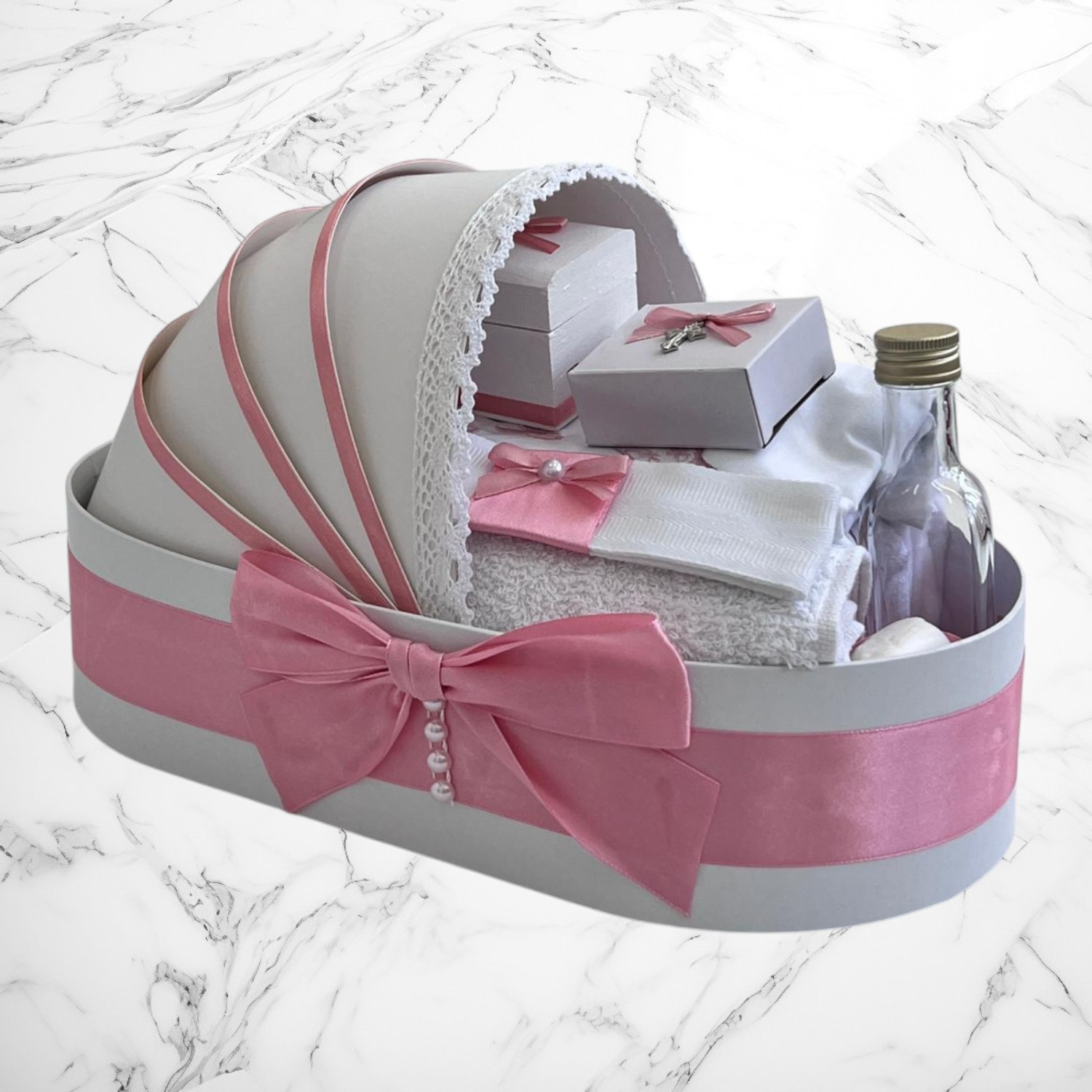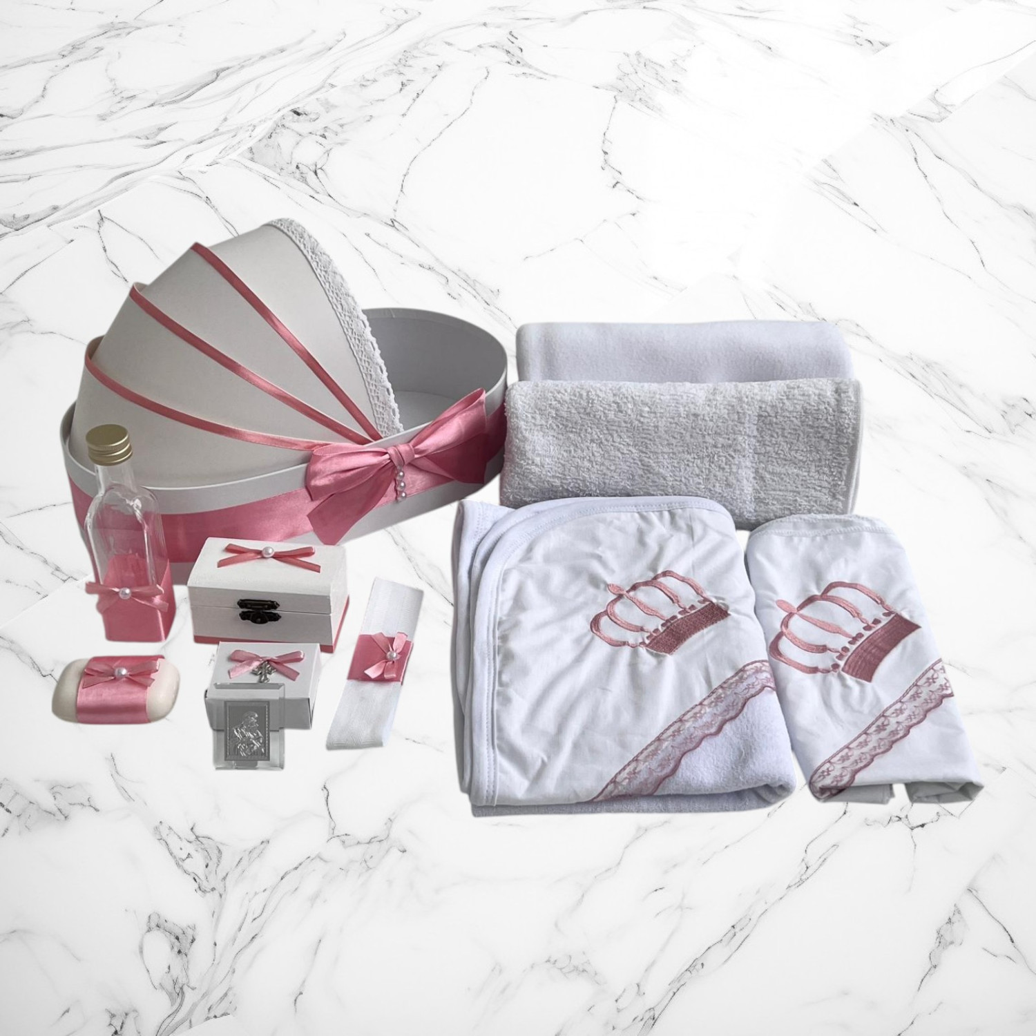 Comanda acum produsul "Set botez Lumânare, Trusou, Cutie hainuțe bujor coroniță roz pudră".
