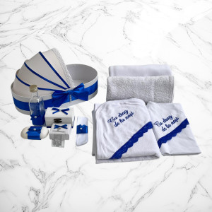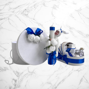 Comanda acum produsul "Set botez Lumânare, Trusou, Cutie hainuțe bujor Cu drag de la nași – albastru".