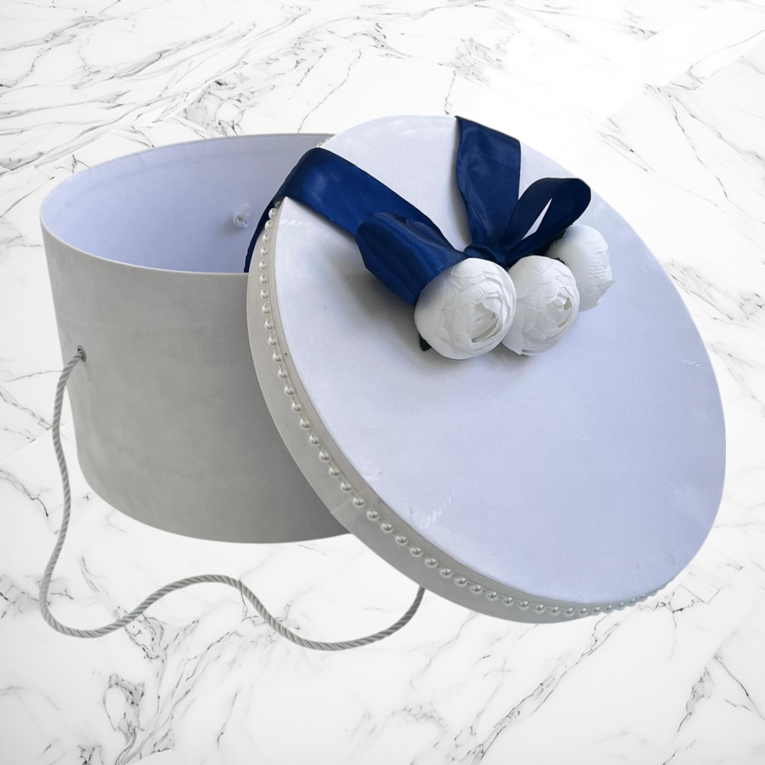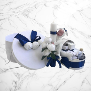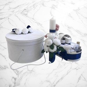 Comanda acum produsul "Set botez Lumânare, Trusou, Cutie hainuțe bujor Cu drag de la nași – bleumarin".