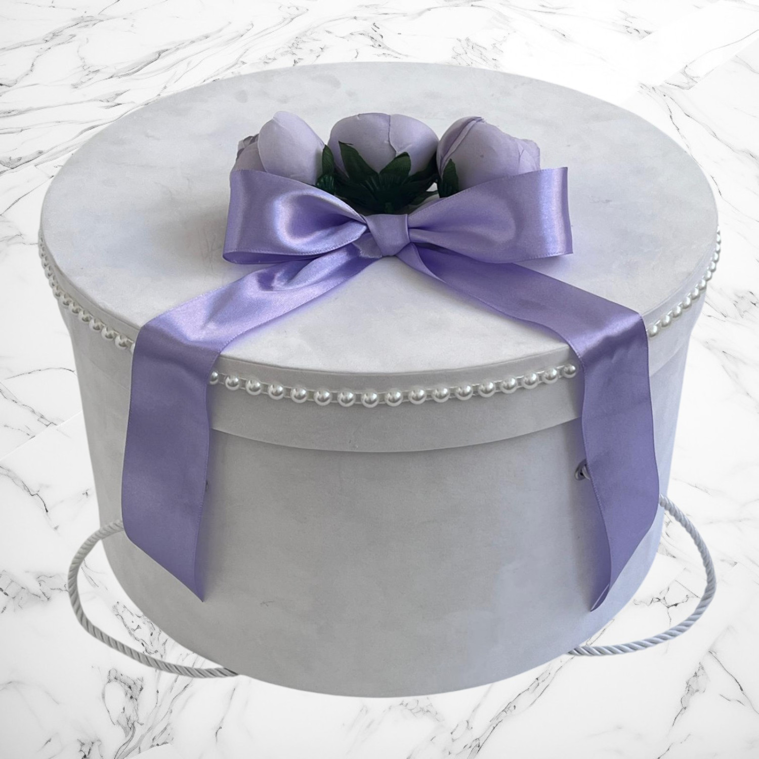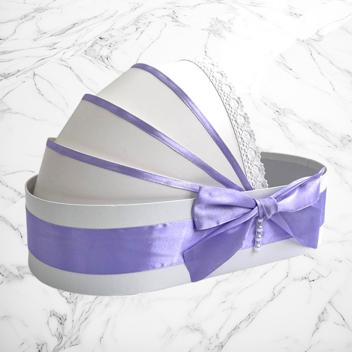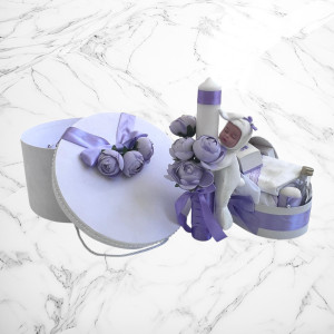 📦 Ambalaj: Toate elementele trusoului sunt așezate într-o cutie albă din carton, în formă de landou, decorată cu fundă și perlute
