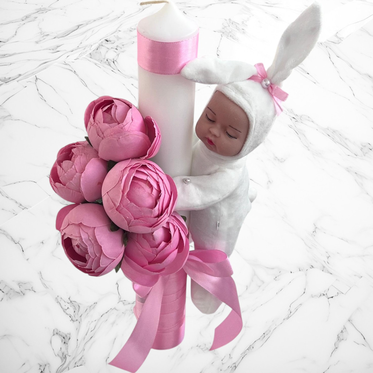 Decor: Manual, cu bujori artificiali, panglică din satin și bebeluș de pluș detașabil