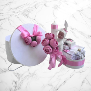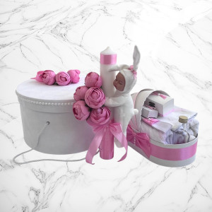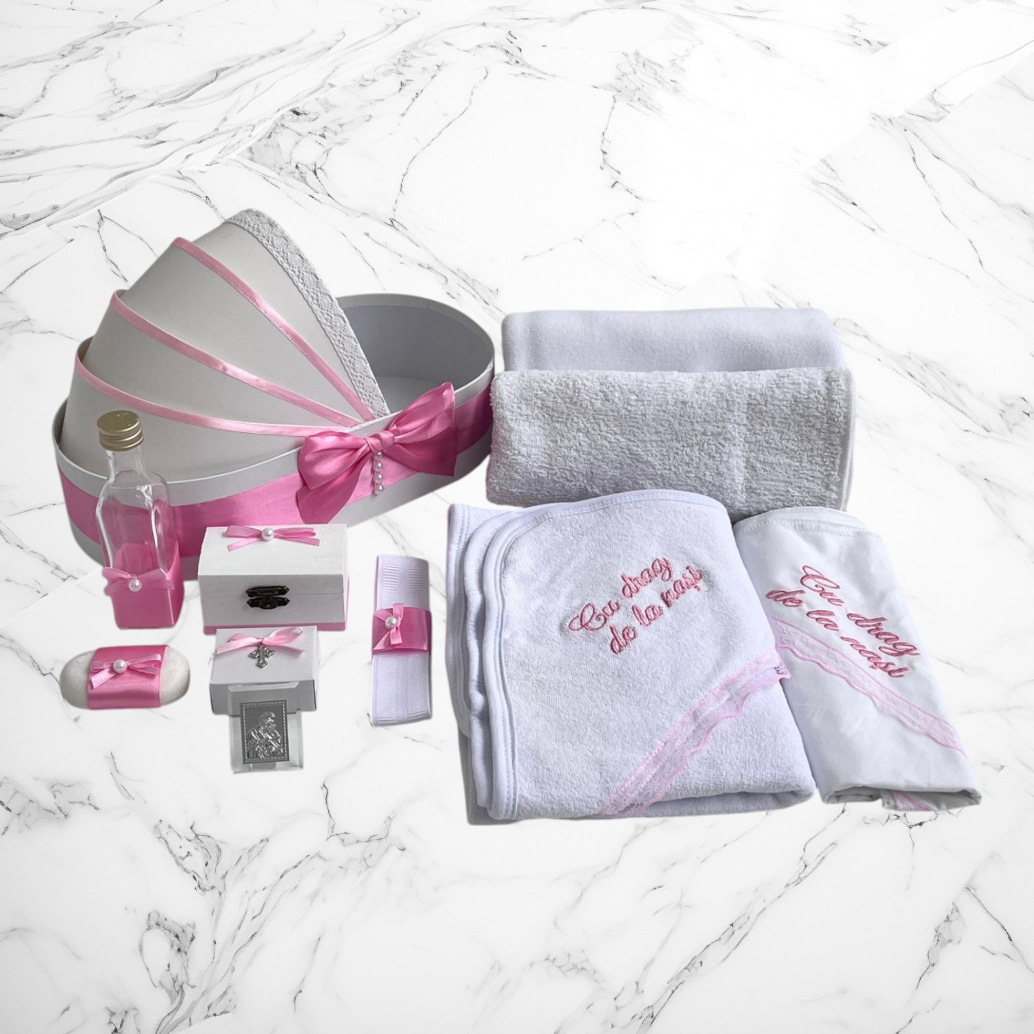📦 Ambalaj: Toate elementele trusoului sunt așezate într-o cutie albă din carton, în formă de landou, decorată cu fundă și perlute