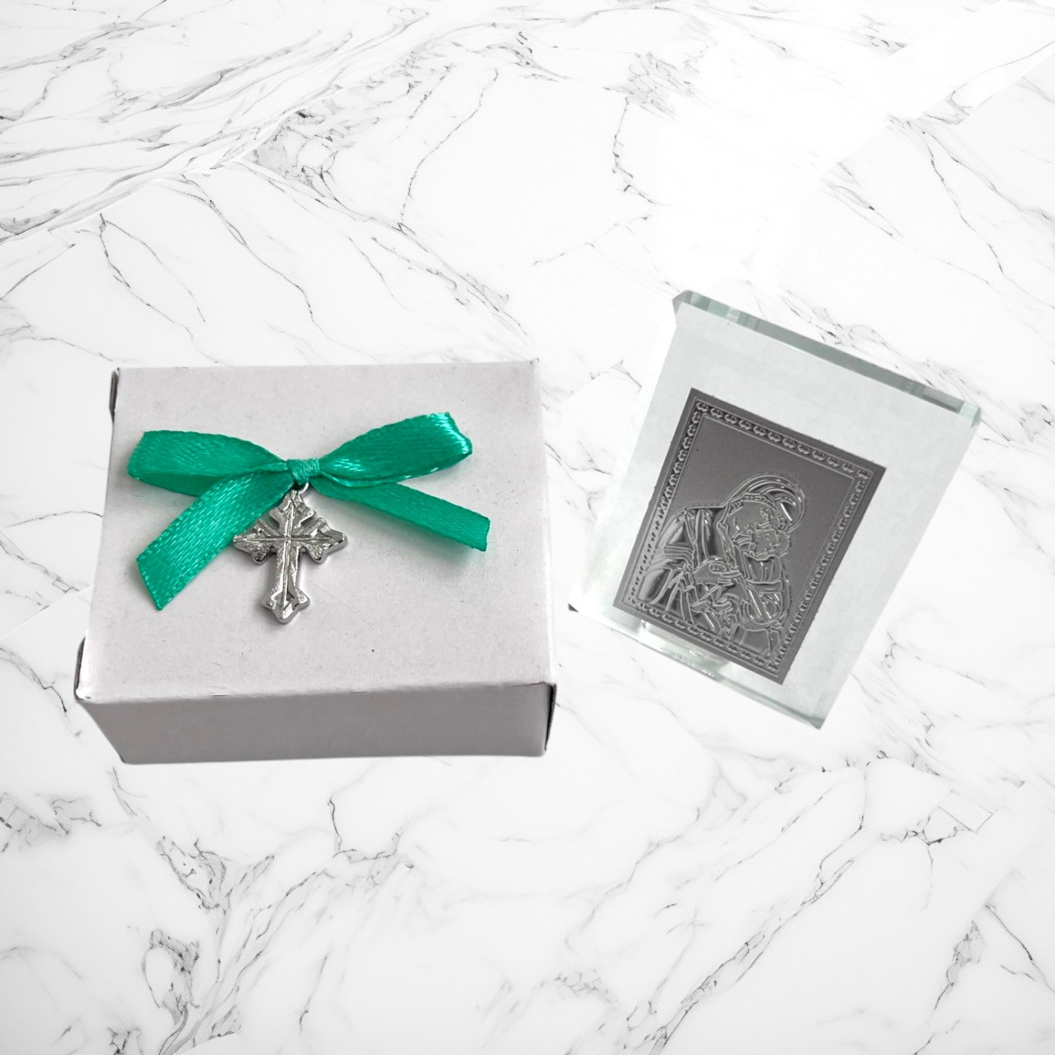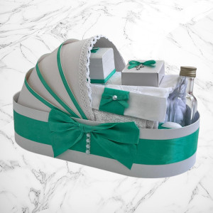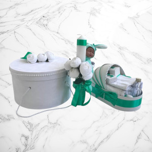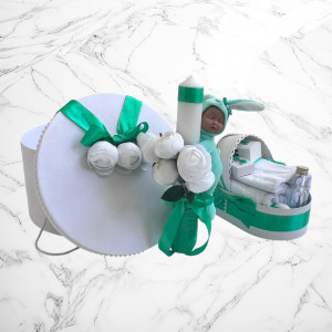 Comanda acum produsul "Set botez Lumânare, Trusou, Cutie hainuțe bujor Cu drag de la nași - verde mentă".