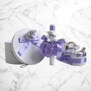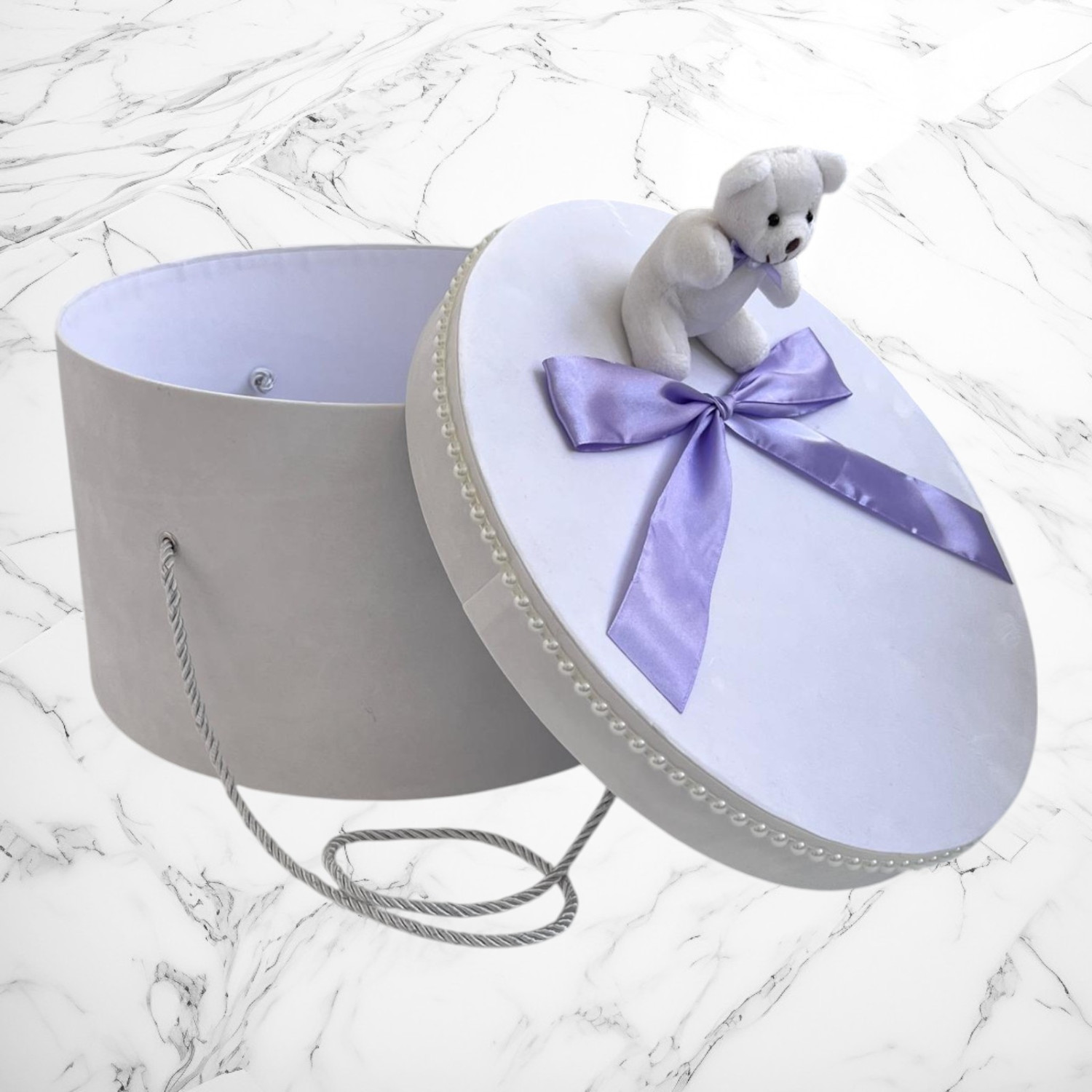 📦 Ambalaj: Toate elementele trusoului sunt așezate într-o cutie albă din carton, în formă de landou, decorată cu fundă și perlute
