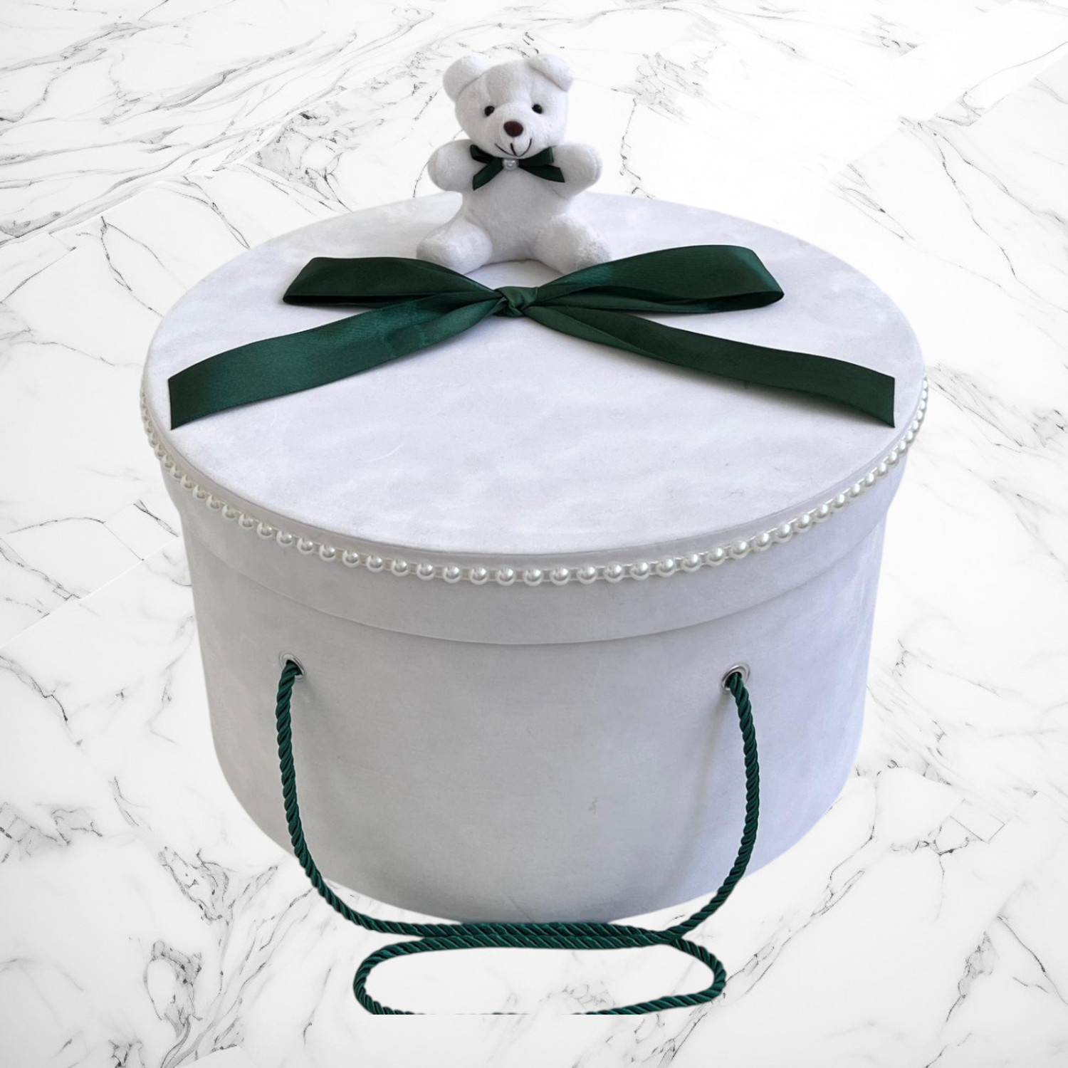 Decor: Manual, cu pampon din tulle, panglică din satin și ursuleț de pluș detașabil