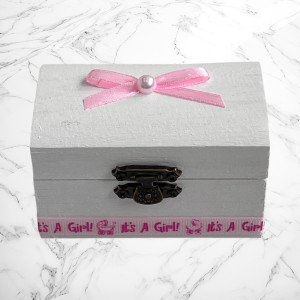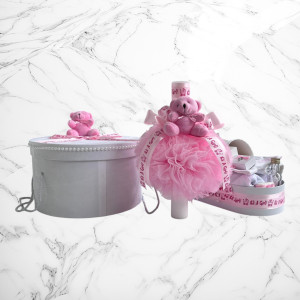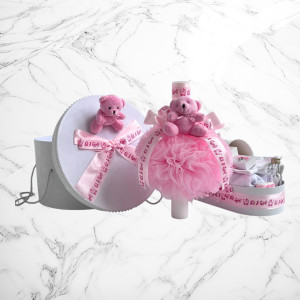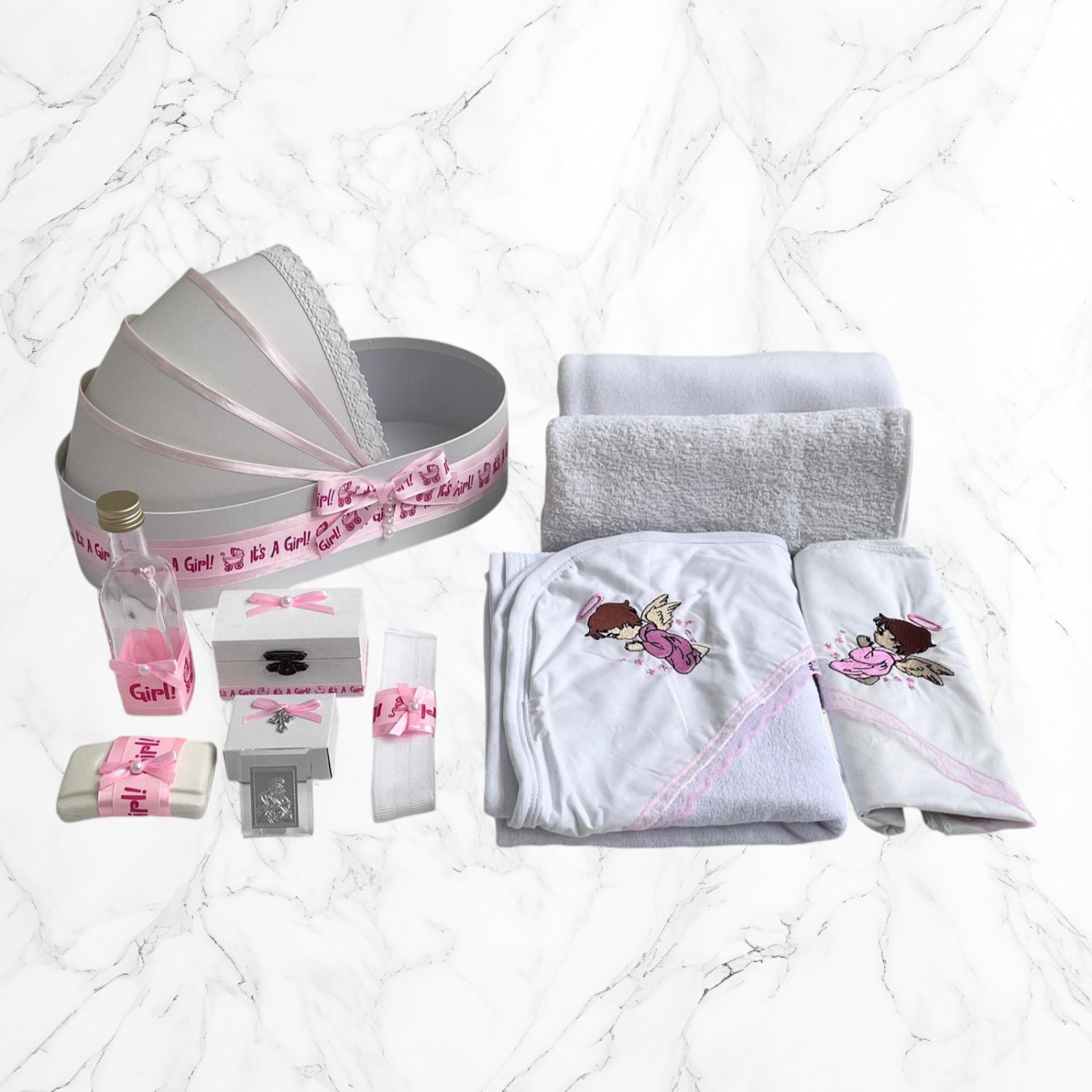 Comanda acum produsul "Set botez Lumânare, Trusou, Cutie hăinuțe îngeraș roz It s a girl".