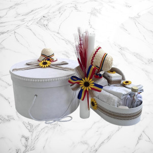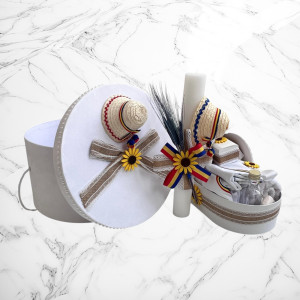 Alege un set de botez tradițional, cu design autentic românesc, perfect pentru ceremonia de creștinare a micuțului tău. Setul conține o lumânare decorată cu motive populare și un trusou complet, realizat din materiale de înaltă calitate, cu dantelă și broderii fine și o cutie pentru hăinuțe.👶✨