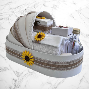 📦 Ambalaj: Toate elementele trusoului sunt așezate într-o cutie albă din carton, în formă de landou, decorată cu fundă și perlute