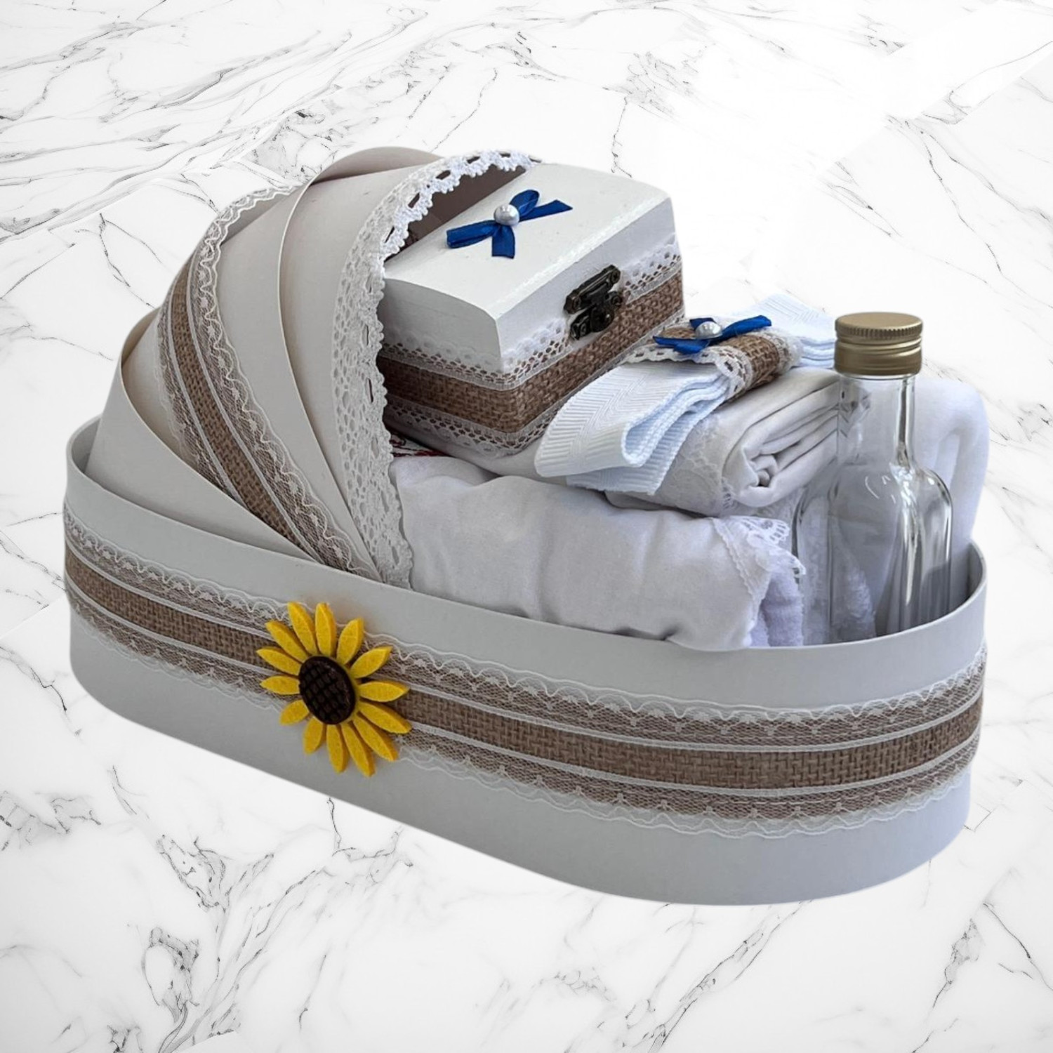 📦 Ambalaj: Toate elementele trusoului sunt așezate într-o cutie albă din carton, în formă de landou, decorată cu fundă și perlute